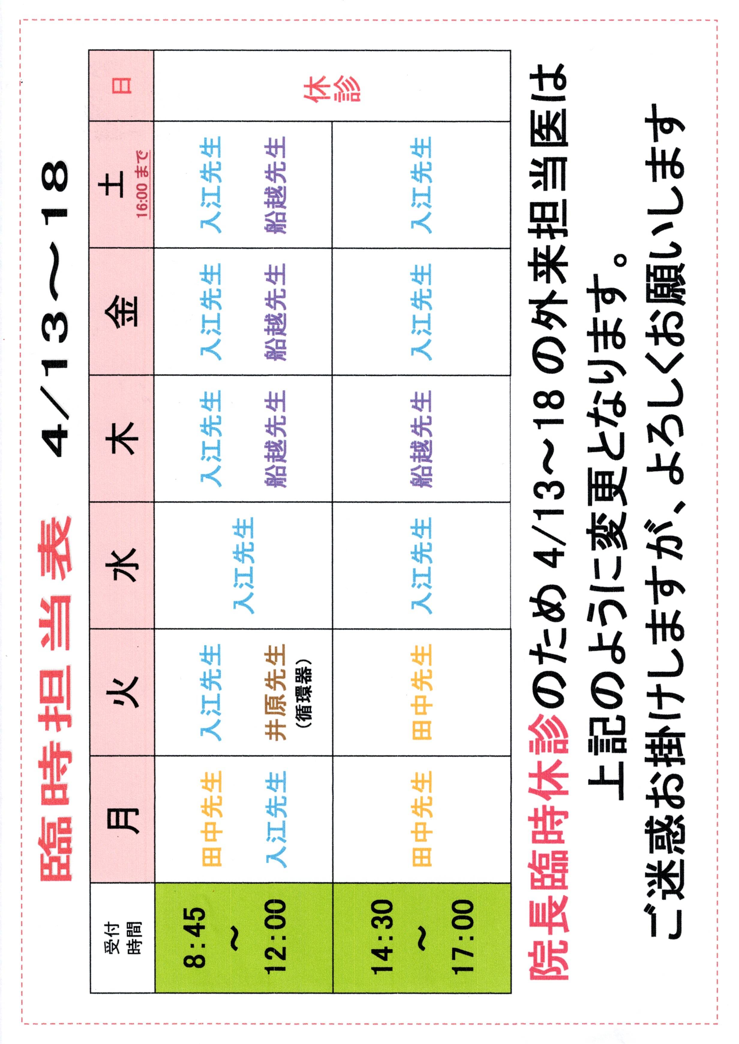 4月10日(金)~18日(土)まで院長外来が休診となります。 その間は入江医師、船越医師、田中医師での診察となります。 ご迷惑をおかけ申し訳ございません。 10日(金) AM 船越医師・田中医師 PM 入江医師 11日(土) AM 入江医師・船越医師 PM 入江医師 13日から18日の担当医は画像をご確認ください。